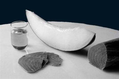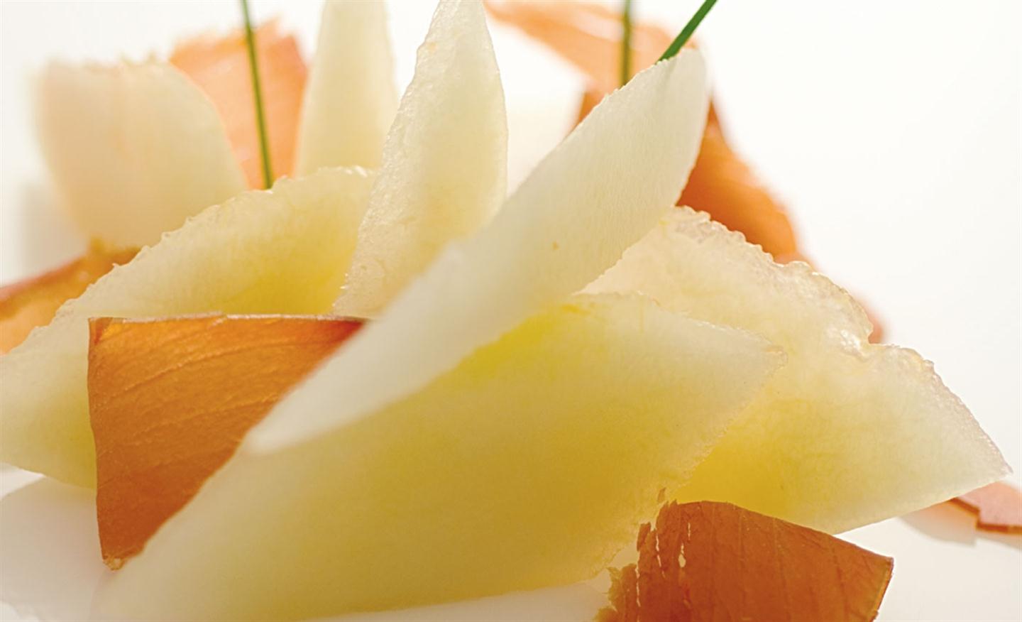 Clean the melon, remove the seeds and slice it. Squeeze the lemon and pour the juice in a container, add salt and black pepper as needed, emulsify and season the melon. Serve it together with the mosciame slices and finally dress with some olive oil.