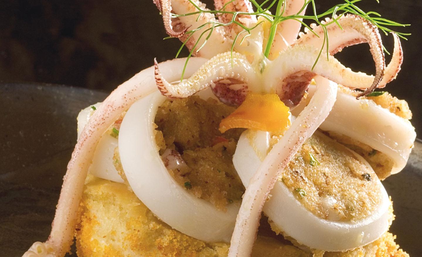 Mix the flour with water and the yeast dissolved in water; finally add salt and a tablespoon of olive oil. Create little mixture balls and leave them to rise for about one hour. Press the mixture balls giving them a round shape, brush them with olive oil and salt, bake them in the oven for about 15 minutes at a temperature of 200°C. Whisk the ricotta twice, together with olive oil, bottarga, black pepper and salt as needed. For the calamari: clean the calamari, remove their skin and chop their wings. Brown them in a pan with garlic, olive oil and parsley. Mix together with breadcrumbs, chopped tomato, mint, eggs and add more salt if needed. Stuff the calamari with the ricotta mixture and bake in the oven for about 10 minutes at a temperature of 180°C always making sure they are cooking properly. Once they cool off, slice them and serve together with the focaccine.